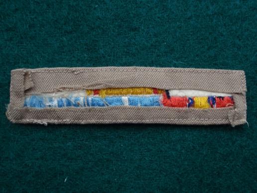 Locally made medal bar. silk medal ribbons sewn directly onto cotton background, a couple of black marks to very bottom of badge, superb quality