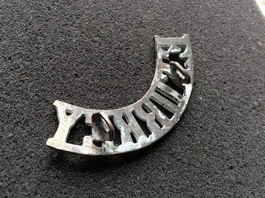 Brass shoulder title that had been white metal plated possibly for a band or Cadets, early example with rear coffin shaped lugs