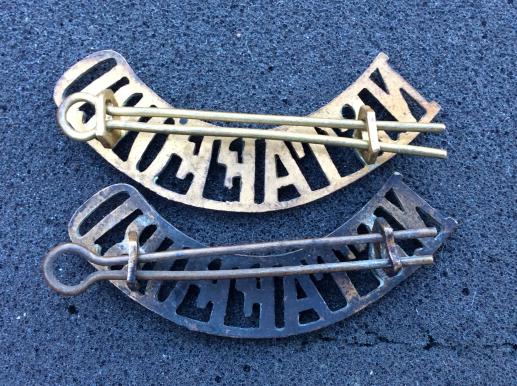 Matching pair of brass shoulder titles with rear coffin shaped lug fixings