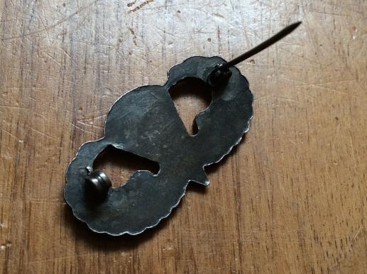 Unmarked brooch back wing with working locking wheel on the pin, nicely aged black patina, probably silver