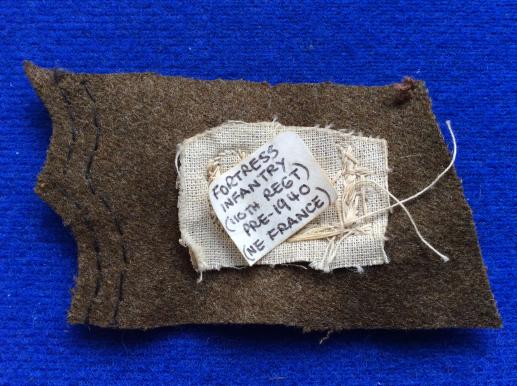 Pre 1940 Fortress Infantry Of the 110 Regiment Collar Badge,based in North East France. The numerals are in gold bullion with the 2 front edge bars being in silver grey material Unusual to find in mint unmothed condition,
