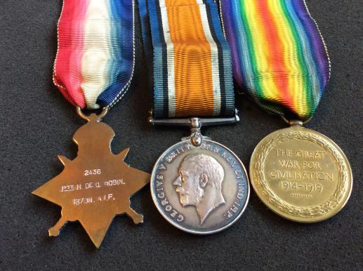 Pte 2438 Herman De Quetteville ROBIN 13th Battalion Australian Imperial Forces Originally enlisted Boulder WA before being released from service to travel to NSW to enlist with his Brother. Following training was sent to Gallipoli arriving late September 1915 after 6 weeks on 20th December during the Evacuation he sprained his ankle being Hospitalised in Alexandria. Herman was then one of 53 men sent to join the 4th Division AFA as part of the 10th Field Artillery Battery in France .Various admissions to hospital followed until August 1918 when Herman was discharged with Delusional Insanity. His complete and fascinating life has been recorded with 112 pages of military records and a superbly written history of his military and personal life covering his complex life and struggles until his death being privately produced and available for all to read. Please google this man and read this document about the De Quetteville ROBIN family held on the Mosman council N.S.W library website. I have never seen such a comprehensive archive about a fascinating man and his tragic life, my short description cannot do the archive held on him justice. The medals are correct in every way .