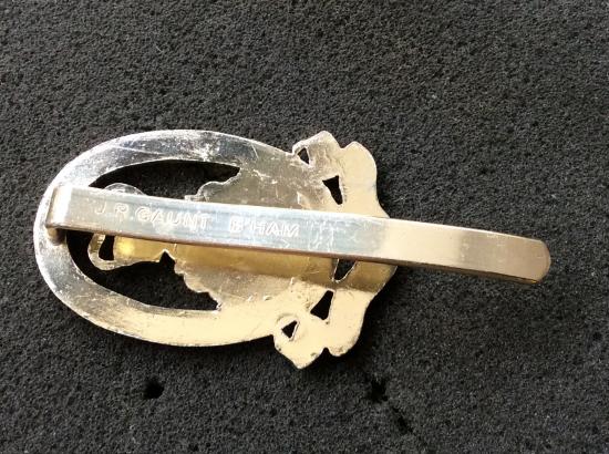All gold coloured A.A cap badge with a very long rear slider, not sure why, Made By Gaunt