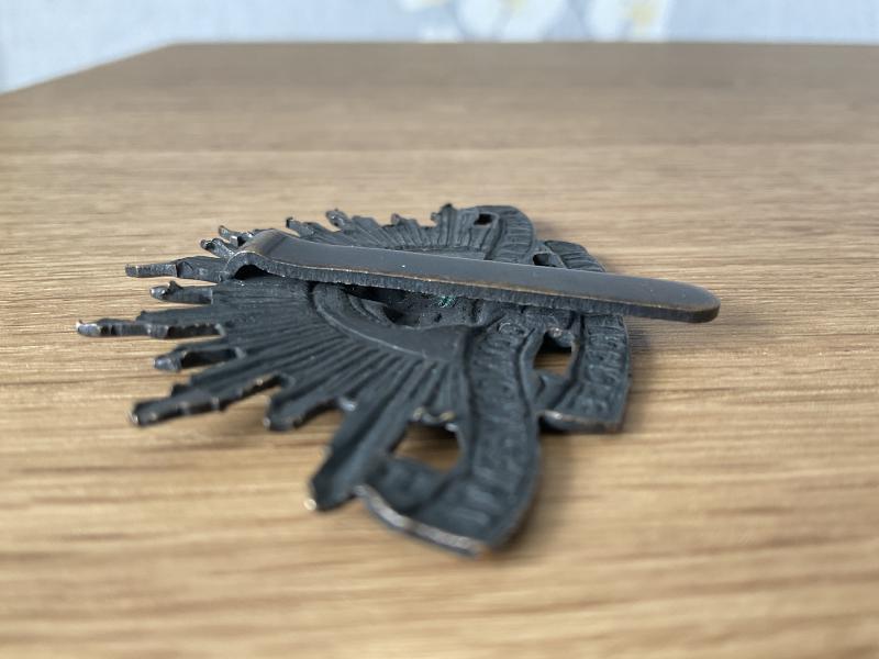 Nice British made slider version Rising Sun retaining its original finish, what makes this an unusual version is the rolled over shape of the slider and the shoulder of the slider is only about 2mm away from the back of the badge, the sun rays are also poorly stamped, certainly an economy version quickly produced