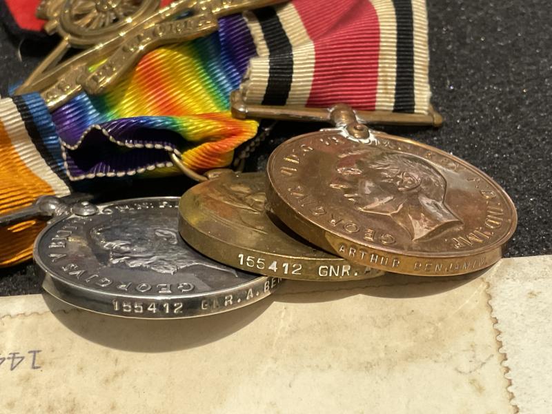 Mounted group of 3 Medals , cap badge , service numbered spoon and service stripes worn by Gunner Arthur Benjamin who later served as a special in Herefordshire.