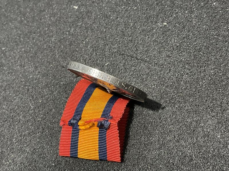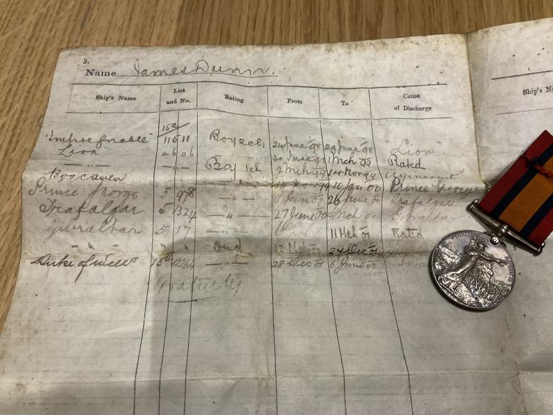 Unusual to find a Q.S.A medal issued to an Ordinary Seaman in the Royal Navy, the wording on the medal being J.DUNN ORD, H.M.S GIBRALTAR which is all correctly done, the medal being in great condition , his certificate of service is in good condition and shows