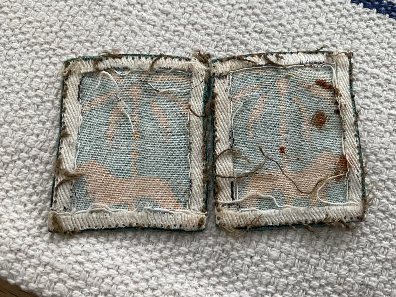 Matching facing pair of formation signs , removed from uniform , some slight rust stains to left side badge