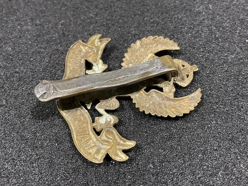 Large brass cap badge with nice age patina and just a slight rubbing to the high spots from normal service wear, please note that the rear slider has some old soldier residue on it this was possibly from one being mounted on a trophy or trench art, , badge also has the correct strengthening wire behind the crown
