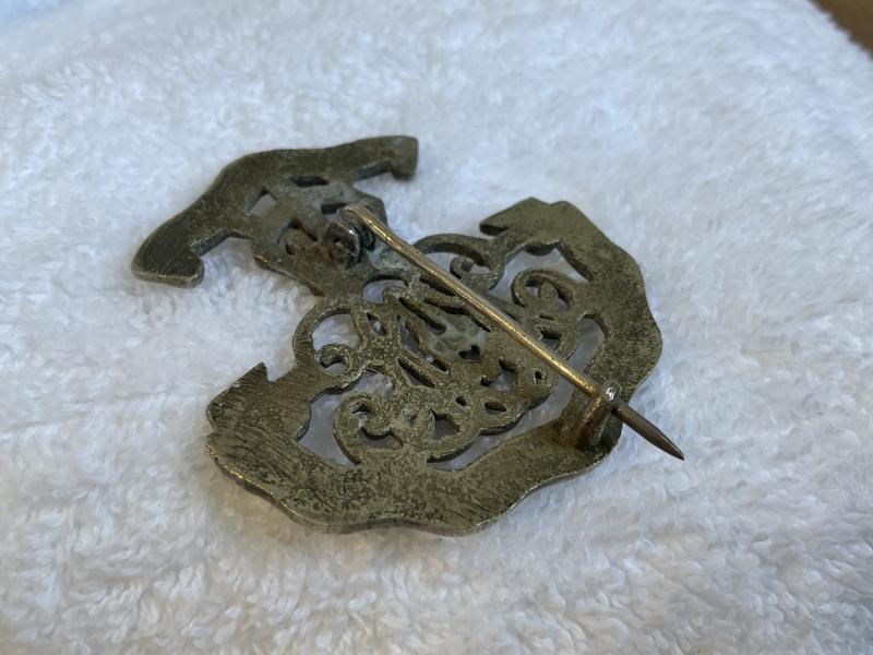 Large locally made brass pugri pin backed head dress badge worn by mess waiters in Indian