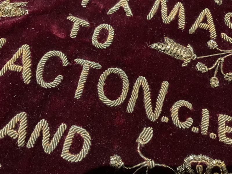 Beautifully made gold bullion on deep red velvet miniature xmas gift tapestry dedicated to Doctor , Colonel Hugh William ACTON C.I.E , I.M.S .