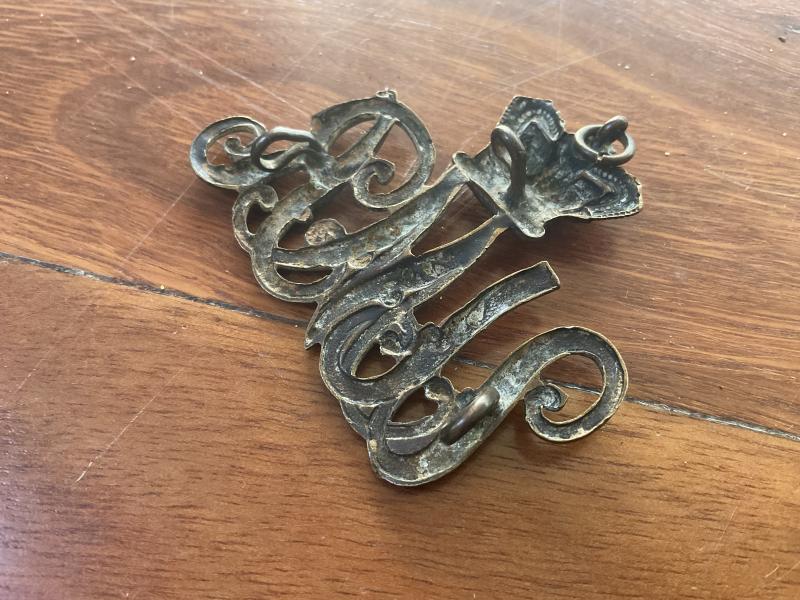Die-stamped blackened brass Queens crown U.M.R slouch hat badge, still retaining the original 3 loop fixings and small ring behind the crown (Owen 444)
