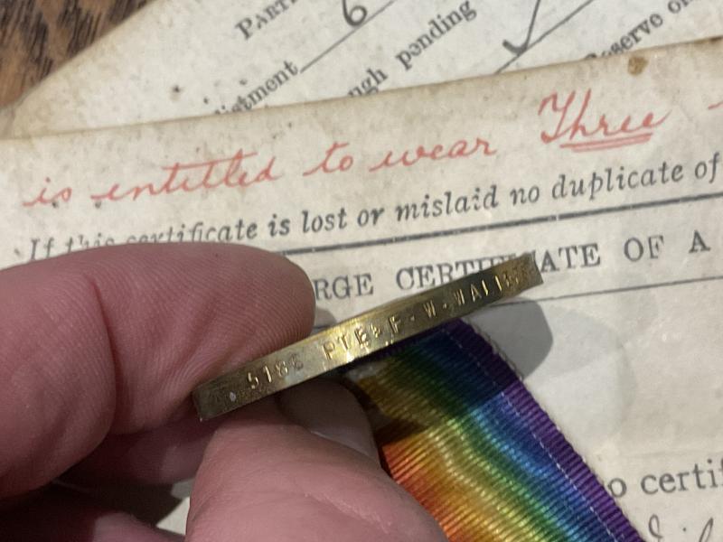 Single Victory medal issued to Private 232195 FRANCIS WILLIAM WALTERS, who served in France and is entitles to 3 wound bars. Originally from East Ham joining in 6/12/15.
