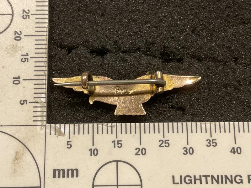 WW2 RAF 9Ct gold miniature pathfinders wing. Obviously a high quality badge being made of 9 Carat gold (looks better in real life than photo) about half the size of the gilded brass version. Brooch pin fixing works perfectly .